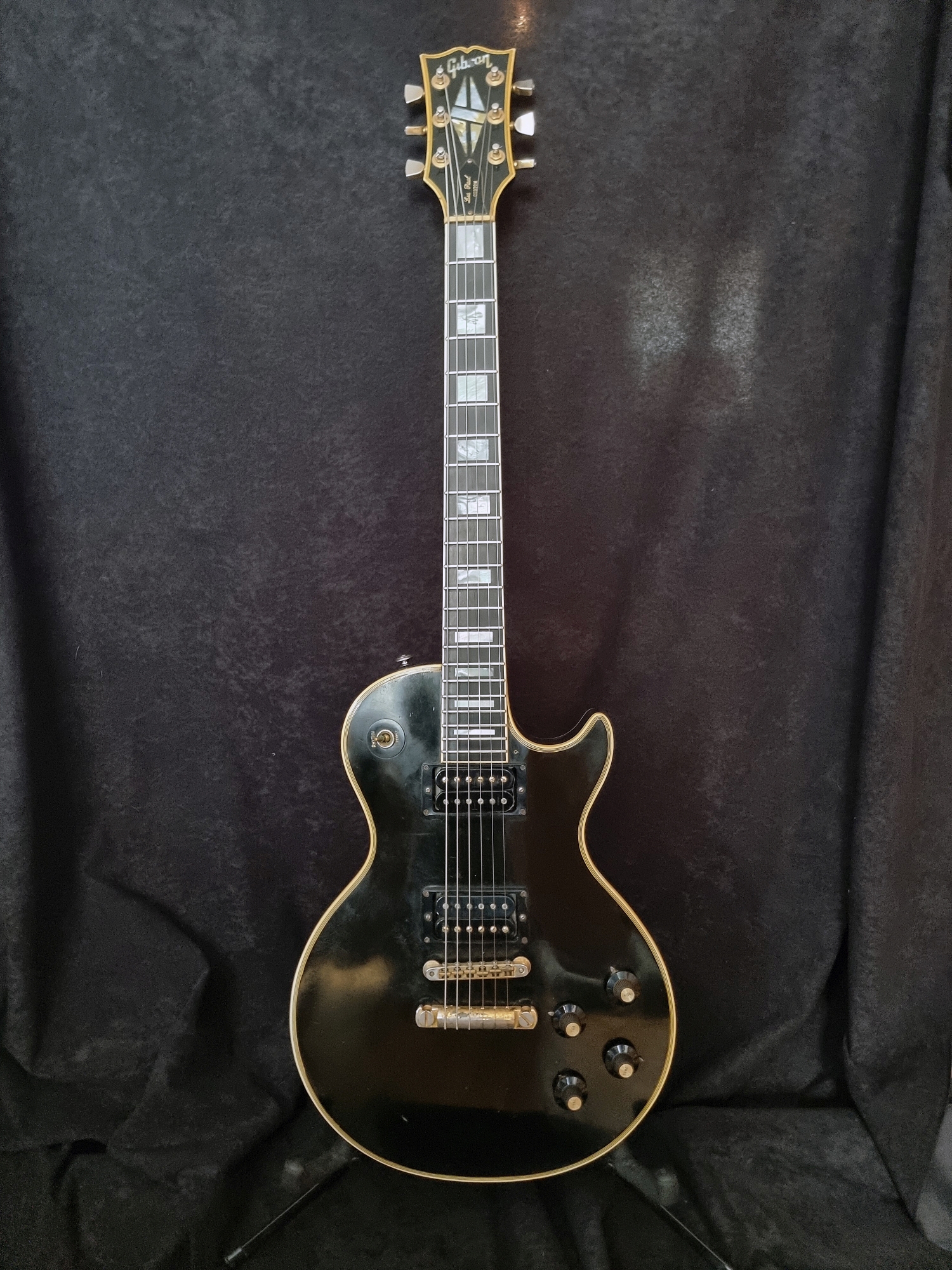 Gibson Custom Black Beauty, year of production 1973. The previous owner was a professionally active musician, so the guitar is was played a lot and sounds powerful. I had planned to keep it, but unfortunately life had a different idea about the future, so I have to let it go. As you can see in the photos, the guitar has traces of use – a standard sacrifice that every instrument must make for being used with love. The scratches visible on the back of the neck are cracks in the paint, not the neck / headstock wood body.